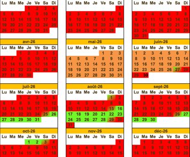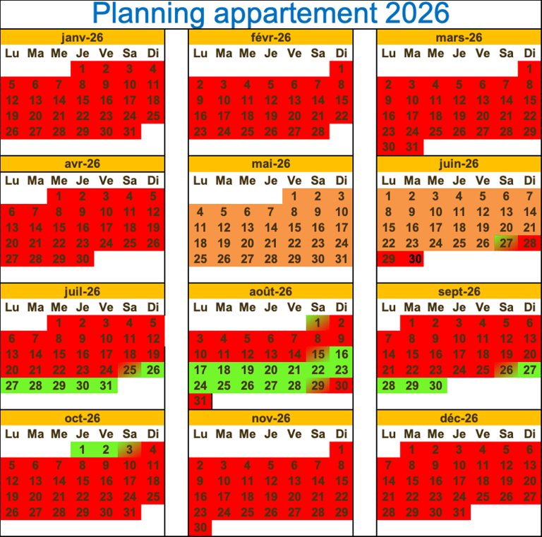 Les locations ont lieu du samedi au samedi. Néanmoins suivant les périodes et les demandes, je peux accepter des séjours plus courts ou depuis un dimanche. En vert disponible, en rouge complet, en orange disponible mais sur demande